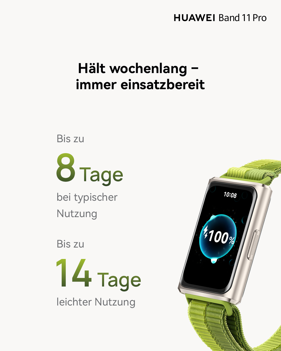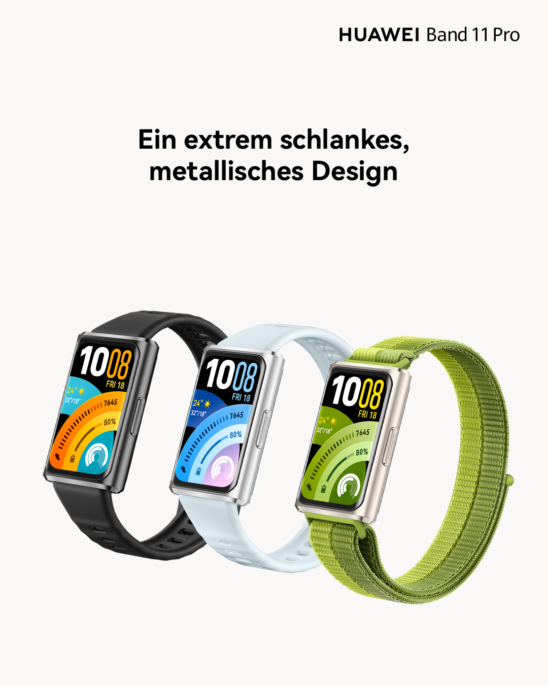 Ob beim morgendlichen Joggen im Park, während eines intensiven Workout-Sessions im Fitnessstudio oder einfach im Alltag – das Huawei Band 11 Pro passt sich deinem Lebensstil an und liefert dir jederzeit verlässliche Daten. Nutze die Gesundheitsfunktionen, um Stress besser zu bewältigen, verbessere deine Schlafqualität und bleibe immer motiviert durch das übersichtliche Tracking deiner Fortschritte. So wird jeder Tag ein Schritt näher zu deinem persönlichen Wohlbefinden.